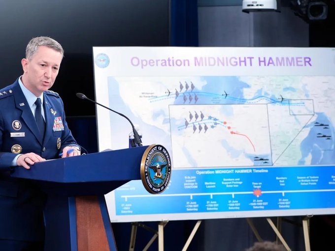 La operación “Martillo de la Medianoche” contra el programa nuclear de Irán involucró a más de 125 aviones estadunidenses incluyendo 7 bombarderos furtivos B-2, múltiples vuelos de cazas de cuarta y quinta generación, docenas de aeronaves cisterna de reabastecimiento en vuelo, un submarino de misiles guiados y cientos de militares.