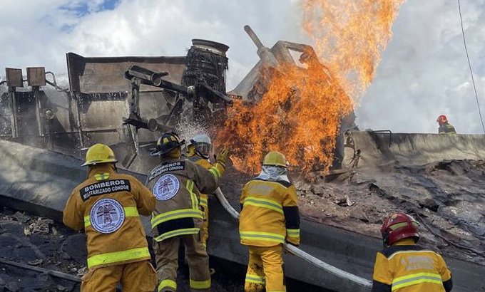 La pipa, con capacidad de 49 mil litros de combustible, chocó contra el muro de contención y volcó lo que produjo una impresionante fuga de gas que en cuestión de segundo se incendió provocando una gran explosión.