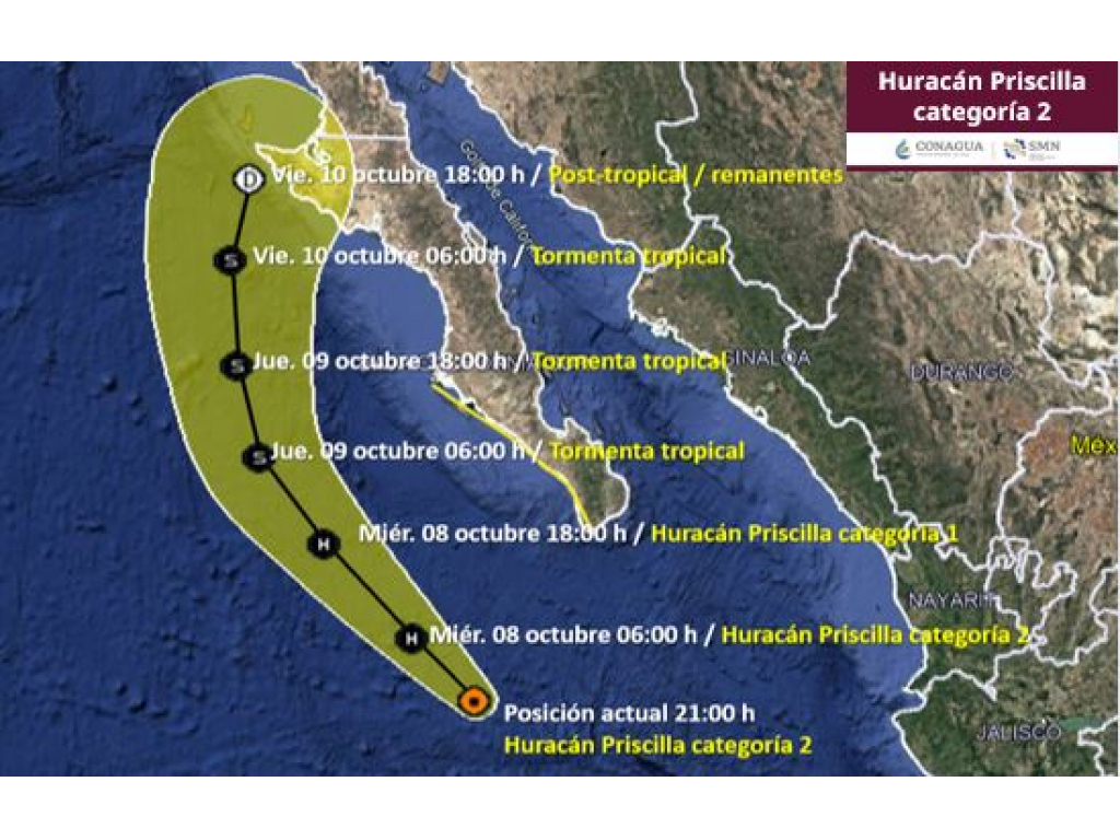 Se localiza a 320 kilómetros de Cabo San Lucas, lleva vientos sostenidos de 175 kilómetros por hora, con rachas de 215 kilómetros por hora, sus bandas nubosas mantendrán lluvias fuertes a intensas, rachas de viento y oleaje elevado en el occidente del país, así como en Sinaloa y Baja California Sur.
