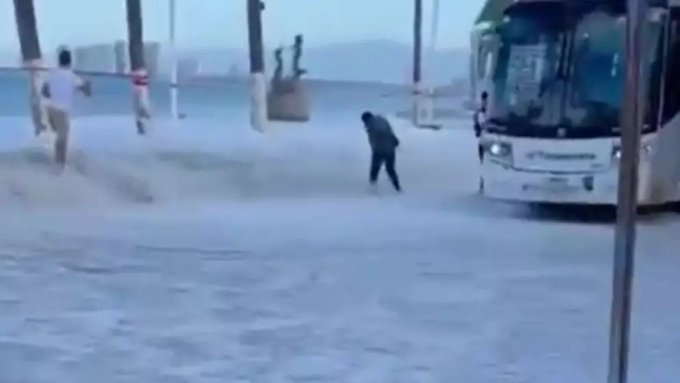 En Puerto Vallarta, Jalisco, se registra alto oleaje y en algunas zonas del malecón y de Playa Las Glorias el mar ha llegado hasta las calles.