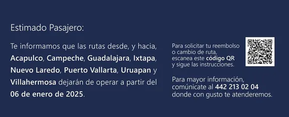 Los vuelos afectados son: Acapulco, Campeche, Guadalajara, Ixtapa, Nuevo Laredo, Puerto Vallarta, Uruapan y Villahermosa.
